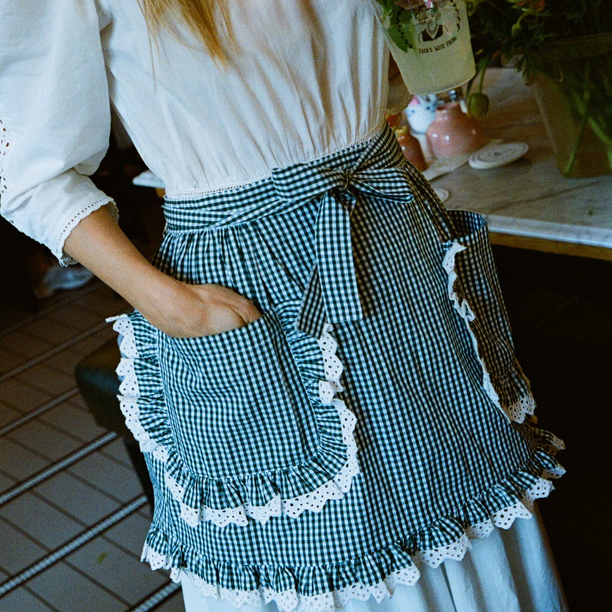 This limited-edition apron in green gingham cotton blends timeless charm with practicality. featuring a strap neck, self-tie waist, two front patch pockets, and a delicate ruffled eyelet trim at the pockets and hem. It's finished with an exclusive Loeffler Randall X Jack's Wife Freda cotton patch logo at the chest. A perfect combination of style and function for your kitchen or gatherings.